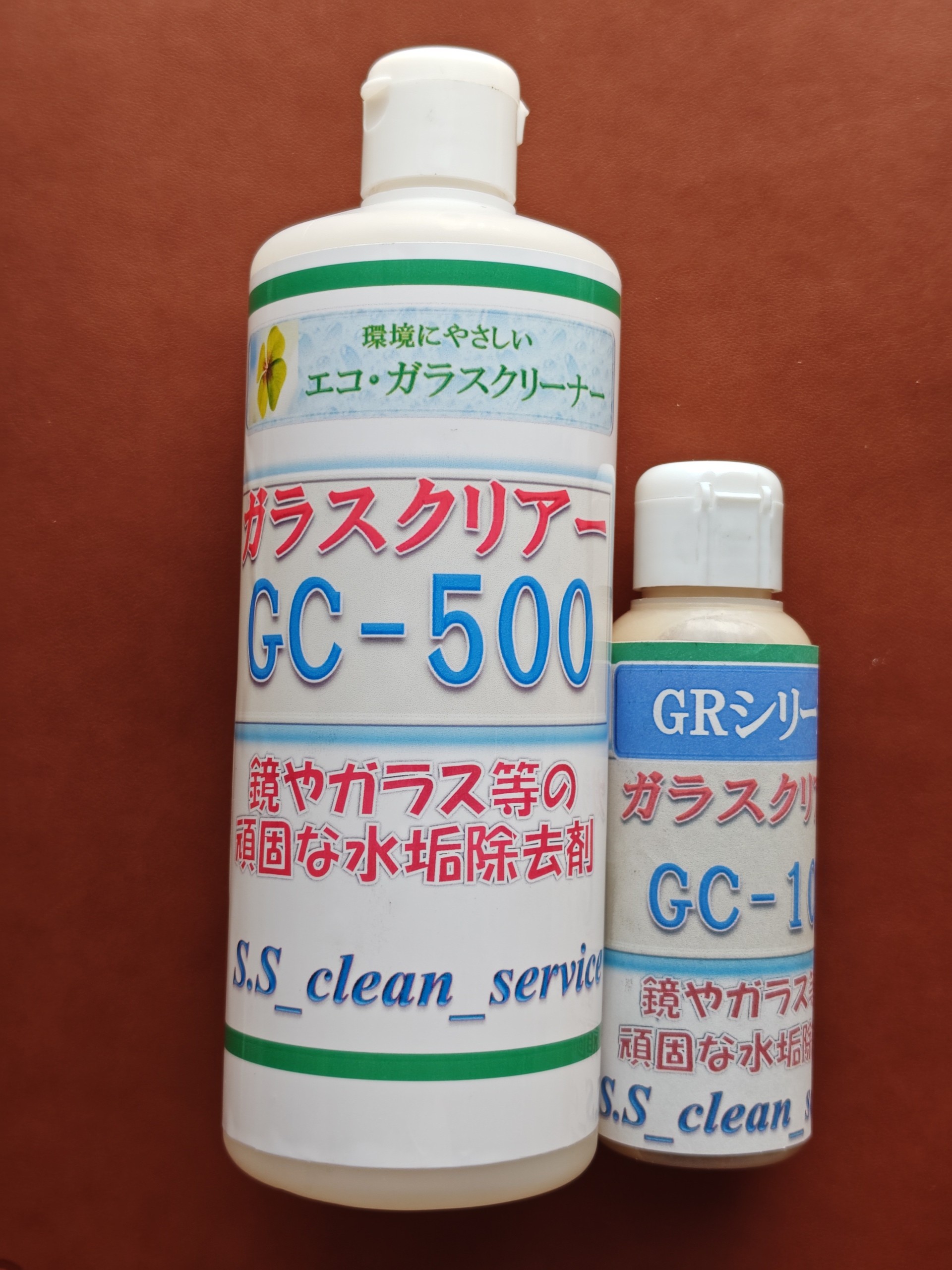 独自に開発したエコ100%の水垢除去剤「ガラスクリアー」は、火山灰から特殊抽出した超微粒子を主成分とし、素材にも環境にも優しいのが特長です。